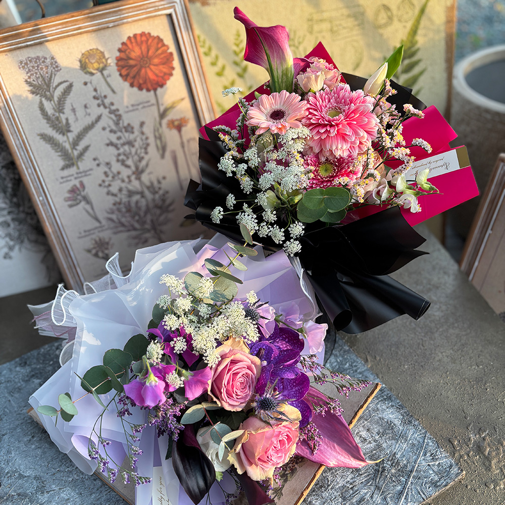 同じ向きに揃えたお花をラッピングし、根元を結んで持ち手とする、伝統的なフラワーギフトです。