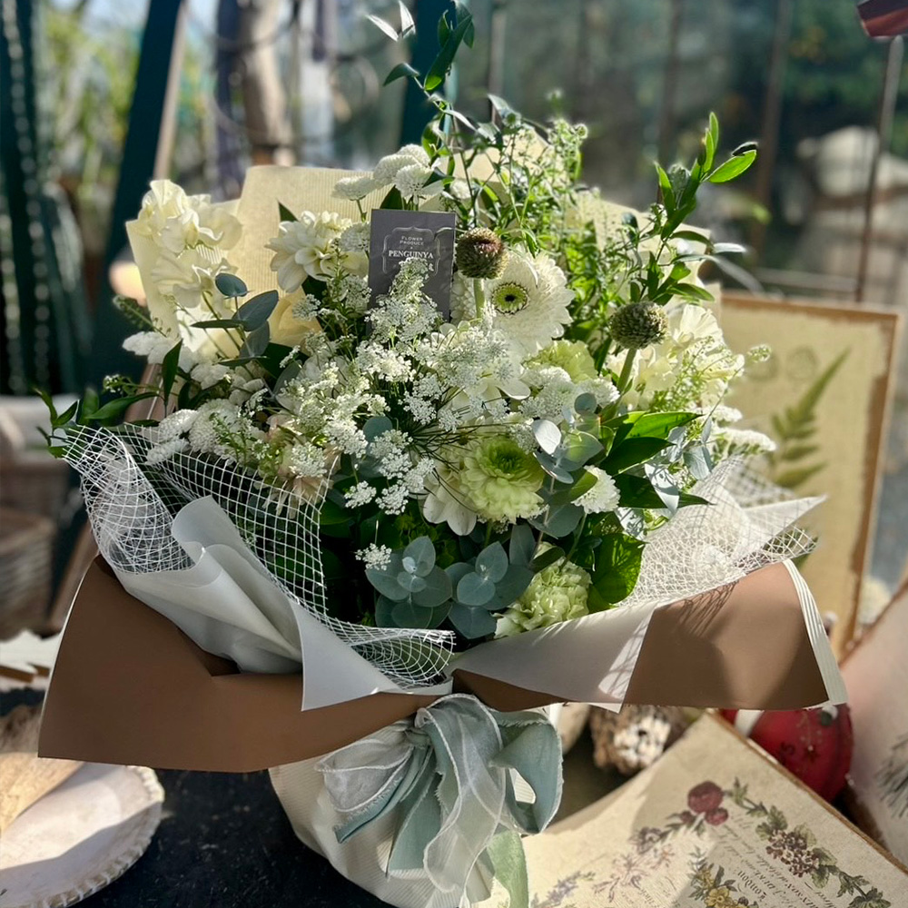 生花の美しさは、永遠というわけにはいきません。 花弁や葉が少し傷んできたときは、アレンジメントは傷んだ部分だけ摘み取り、全体を寄せてバランスを整えなおします。 花瓶に生けた花束は、傷んだお花は茎ごと取り除きます。 全体が傷んできたら、十分楽しませてもらった感謝と共に、処分しましょう。ぺんぎんや Online Storeでの販売について